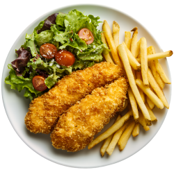 Alaska-Seelachs, gem. Salat und Pommes. |